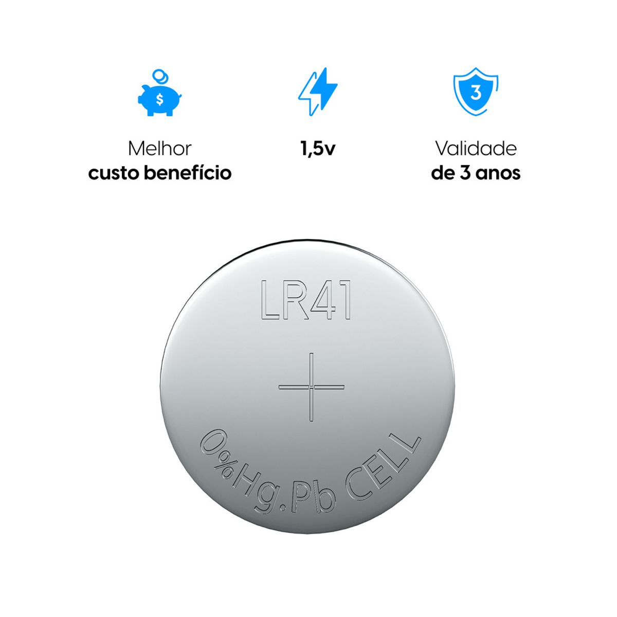 Compatível com diversos equipamentos, a LR41 é amplamente utilizada em relógios, calculadoras, controles remotos de portão, brinquedos, timers, lanternas e pequenos eletrônicos, oferecendo desempenho consistente e boa durabilidade.
