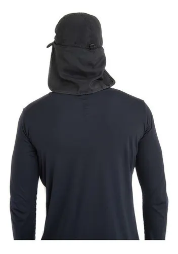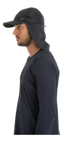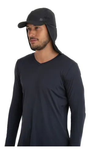 A proteção FPU50+ é aplicada diretamente no fio têxtil, garantindo bloqueio consistente dos raios solares mesmo após lavagens. A aba frontal e a pala estendida protegem áreas sensíveis (orelha e nuca), reduzindo impacto do sol em atividades de longa duração.