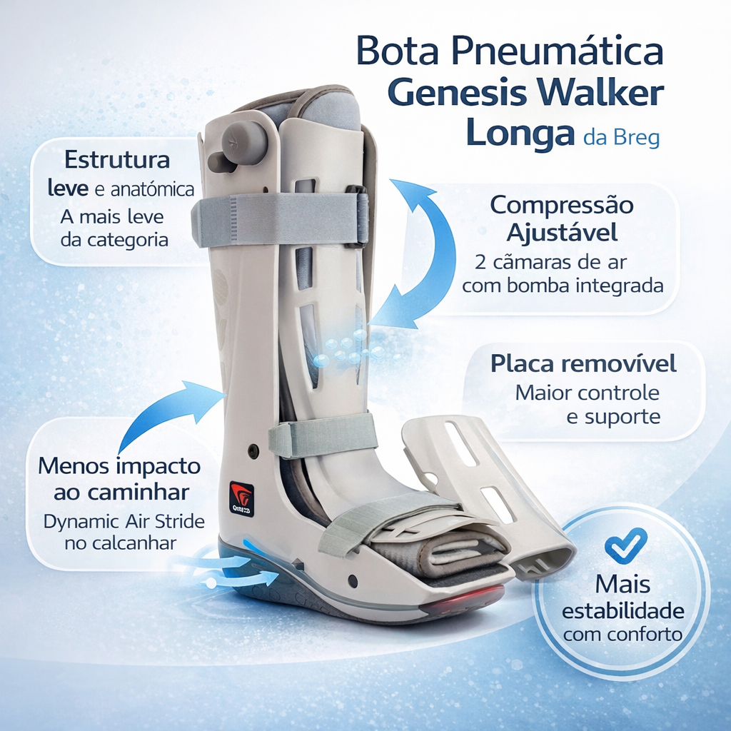 A Genesis Walker Longa Breg é uma bota imobilizadora pneumática indicada para o tratamento de lesões ortopédicas do pé e tornozelo que demandam estabilidade rígida associada à compressão controlada.