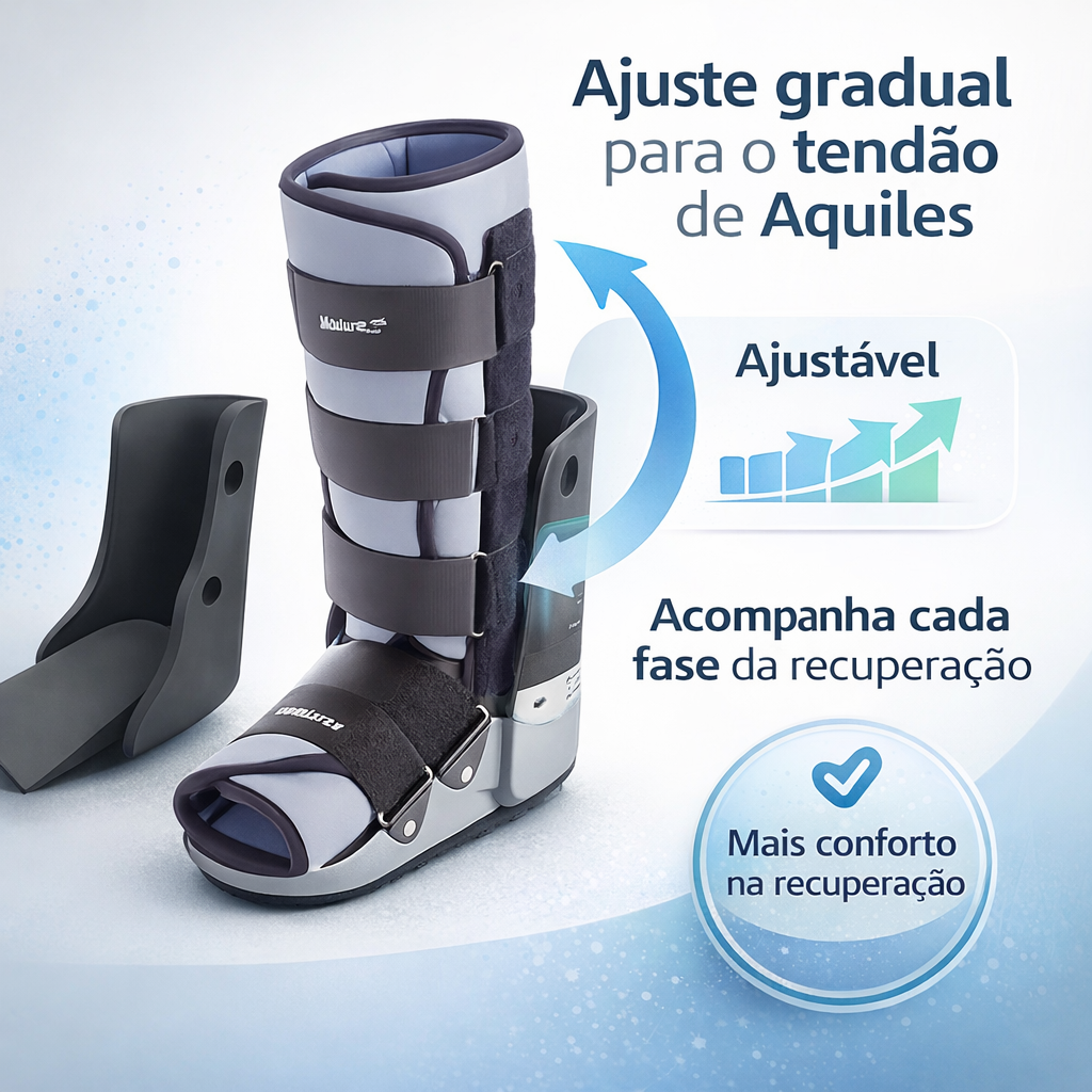 Serve para proteger e estabilizar o tornozelo e o tendão de Aquiles enquanto o paciente avança em uma reabilitação funcional com mobilização ativa e, quando indicado, carga precoce. O ajuste gradual do ângulo ajuda a respeitar o tempo de cicatrização, reduzindo a inclinação até a posição neutra (0°) conforme a evolução clínica.