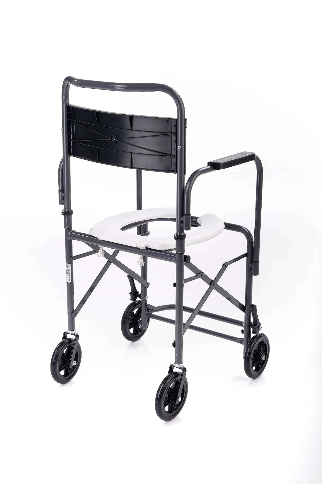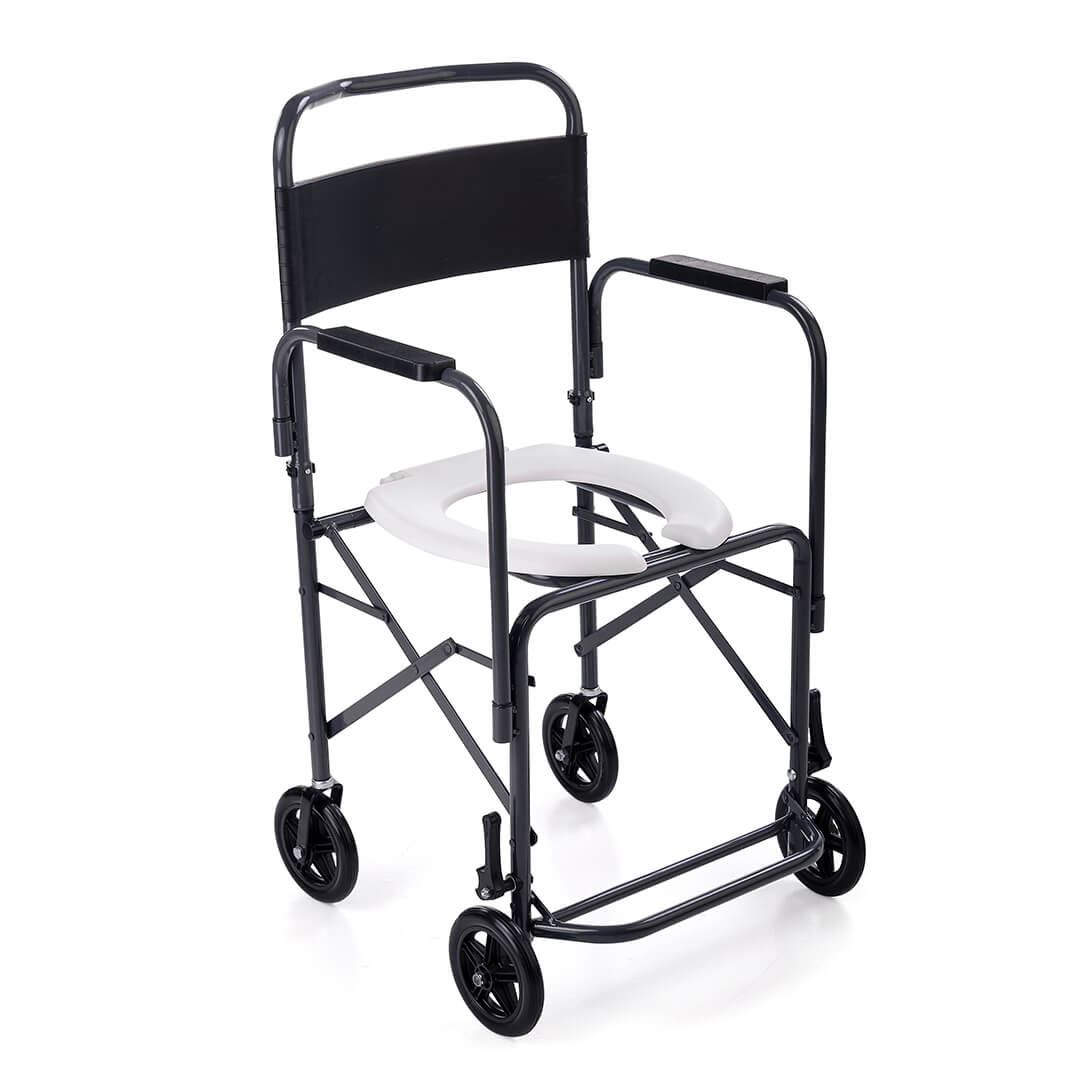 A estrutura dobrável facilita o uso em banheiros compactos e permite guardar a cadeira quando não está em uso, liberando espaço. Com freios dianteiros, apoio de braços fixo e apoio de pés escamoteável, o usuário conta com um apoio firme desde o momento de sentar até o final do banho.