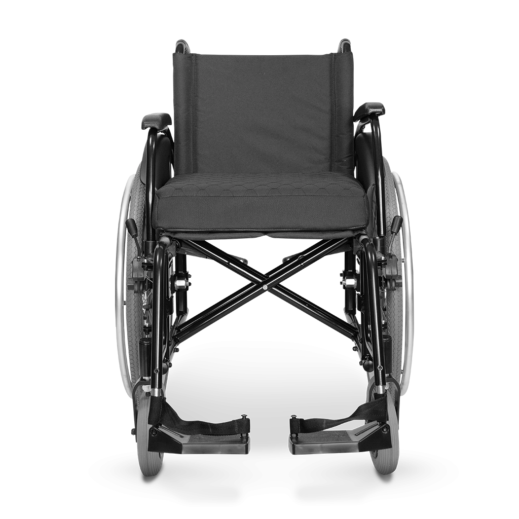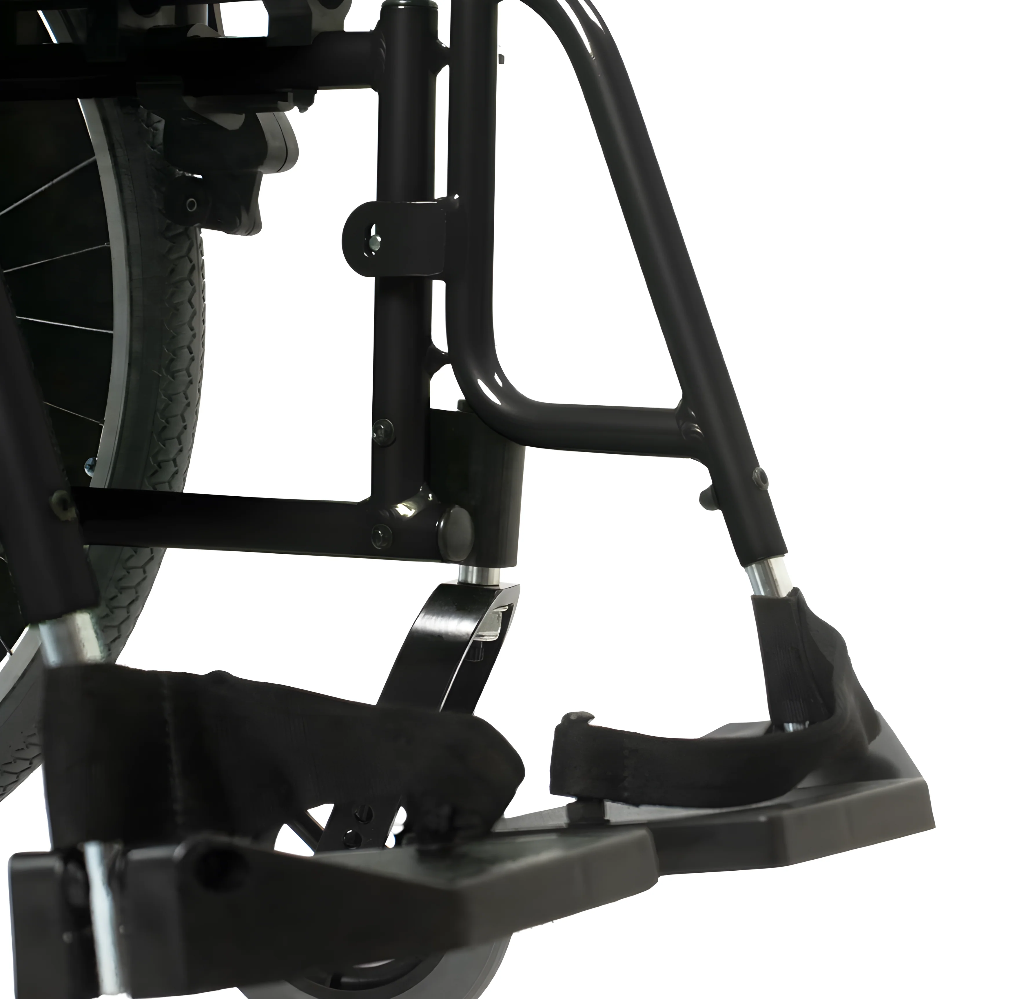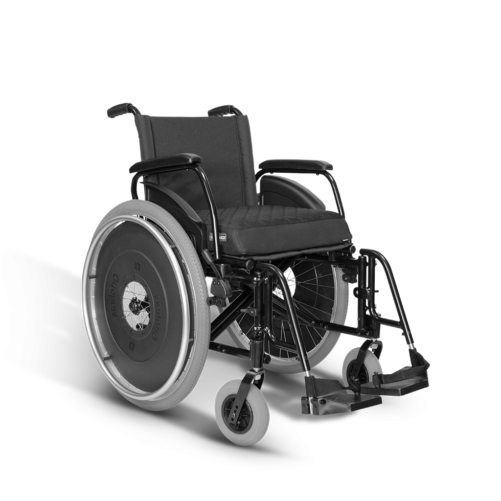 A AVD é uma cadeira de rodas manual dobrável em alumínio aeronáutico, com quadro e eixos desmontáveis para transporte facilitado. Traz apoios de pés fixos em 60° (swing-away), com regulagem de altura e ângulo para melhor postura.
