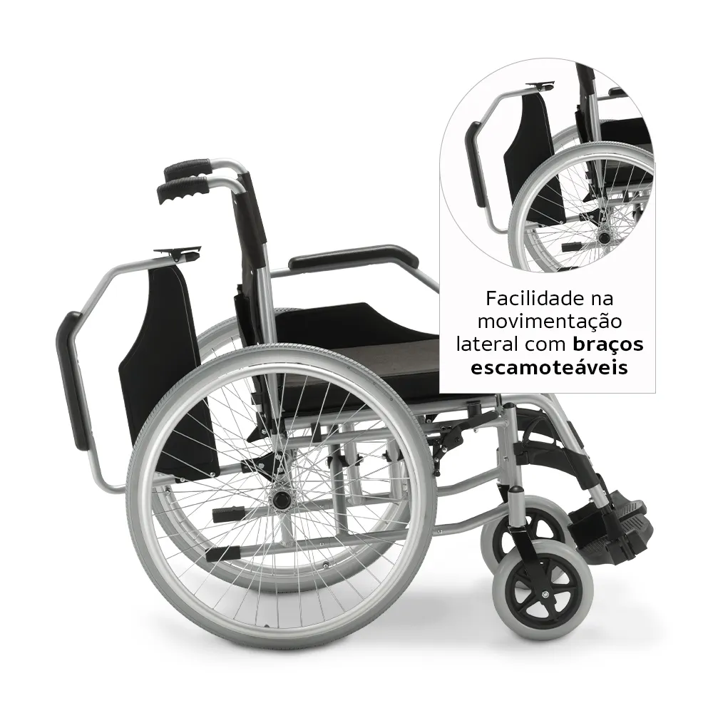 Os apoios de braço da D600 podem ser girados para o lado, liberando o espaço lateral da cadeira. Isso facilita imensamente a transferência do usuário para cama, vaso sanitário, sofá ou banco de carro, sem precisar levantar completamente ou pedir ajuda. É um recurso fundamental para quem busca mais independência no dia a dia.