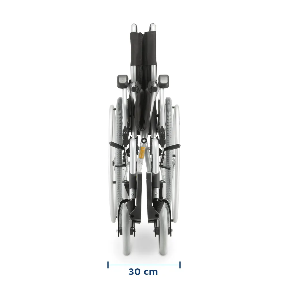 | Rodas traseiras | Raios em aço, aro de propulsão em alumínio, pneu antifuro maciço, quick-release |