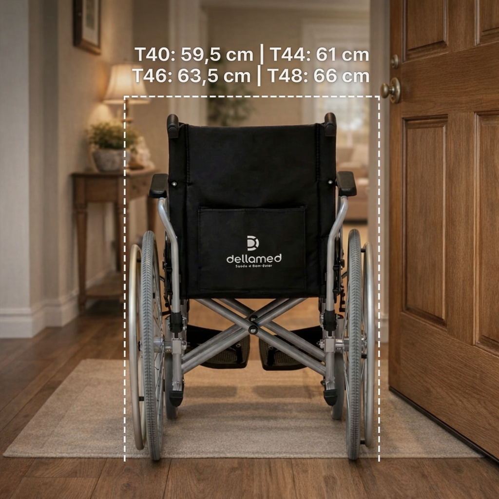 Depende do tamanho escolhido. O modelo T40 tem 59,5 cm de largura total; o T44, 61 cm; o T46, 63,5 cm; e o T48, 66 cm. Some 2 cm de folga para manobrar com conforto. Portas com abertura de 70 cm ou mais acomodam todos os tamanhos tranquilamente.