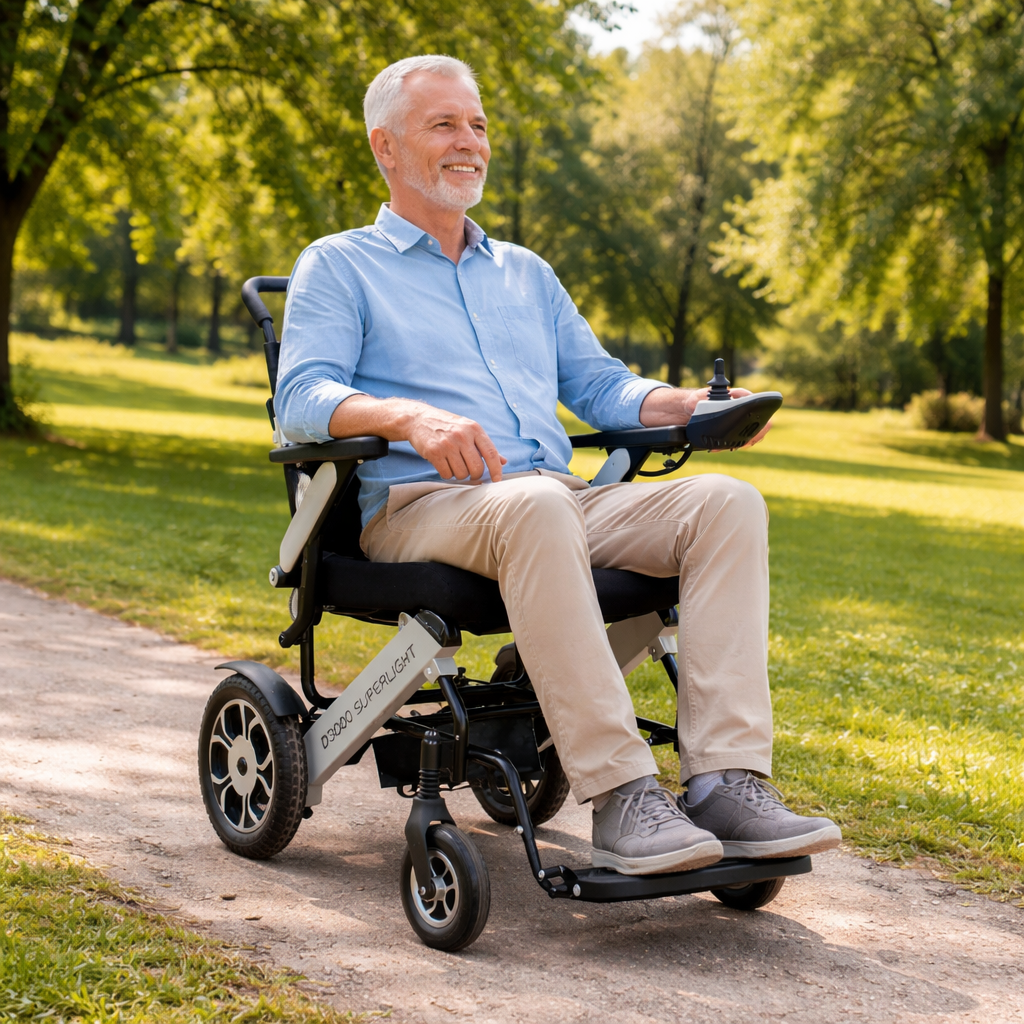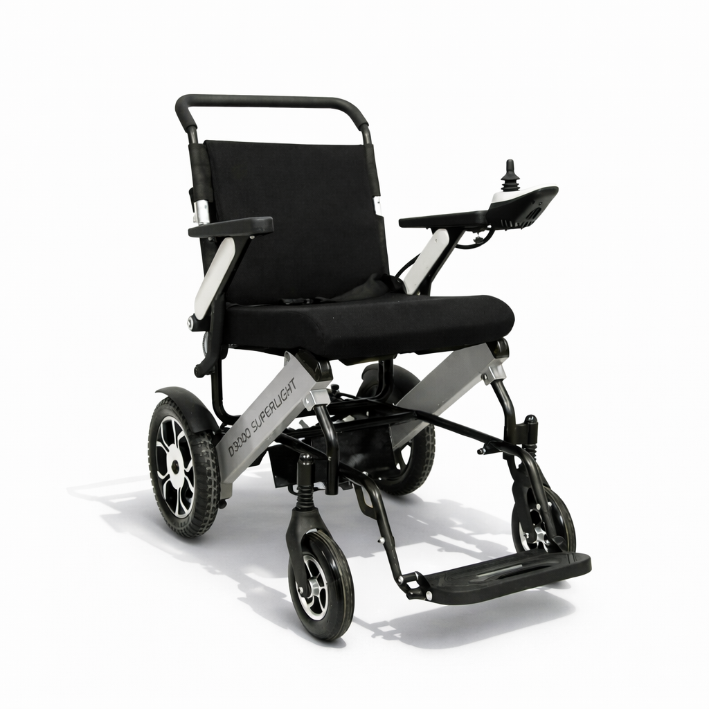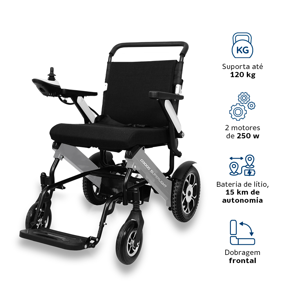 Cadeira de Rodas Motorizada D3000 Super Light Dellamed – apenas 35 kg, dobrável em segundos, estrutura em alumínio, baterias de lítio removíveis e até 20 km de autonomia. Perfeita para uso diário, viagens e embarque em aviões com total independência.