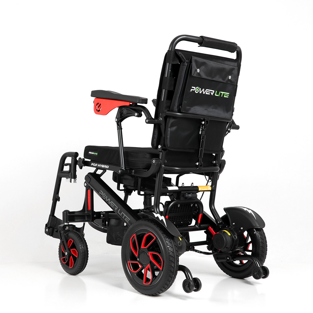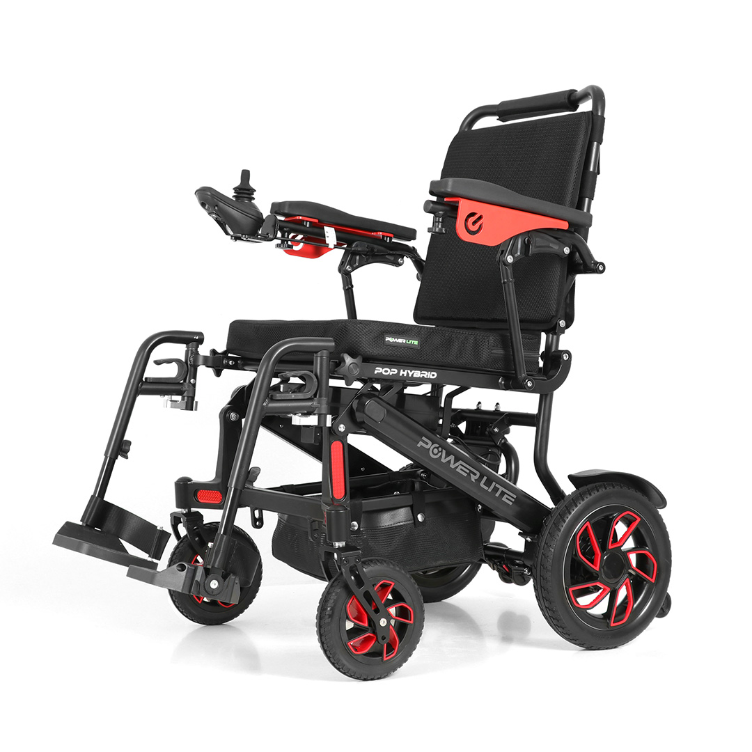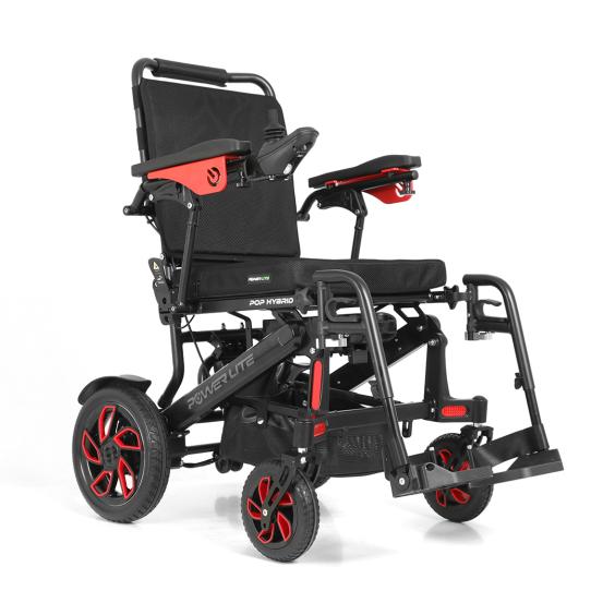 Cadeira de Rodas Motorizada Pop Hybrid Power Lite – estrutura em alumínio leve de apenas 31 kg, reclinável até 15°, autonomia de 15 km com bateria de lítio (levável em aviões), joystick multifuncional com lanterna e USB, anti-tombo removível e cesta inferior espaçosa. Suporta até 120 kg para uso interno, externo, passeios e viagens.