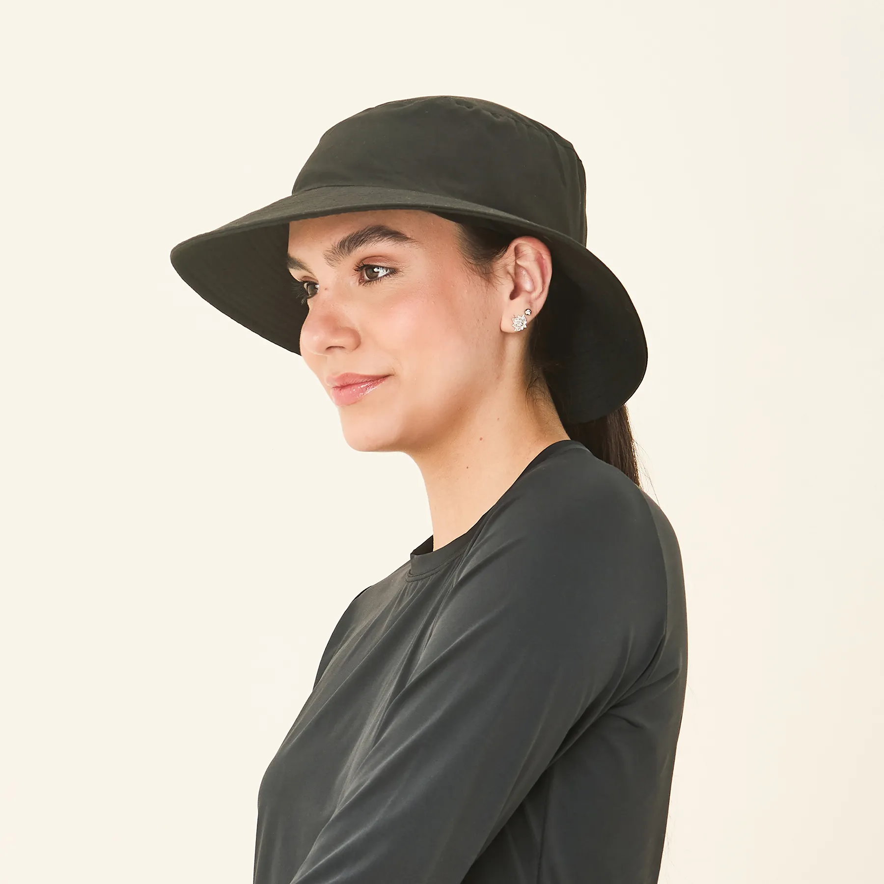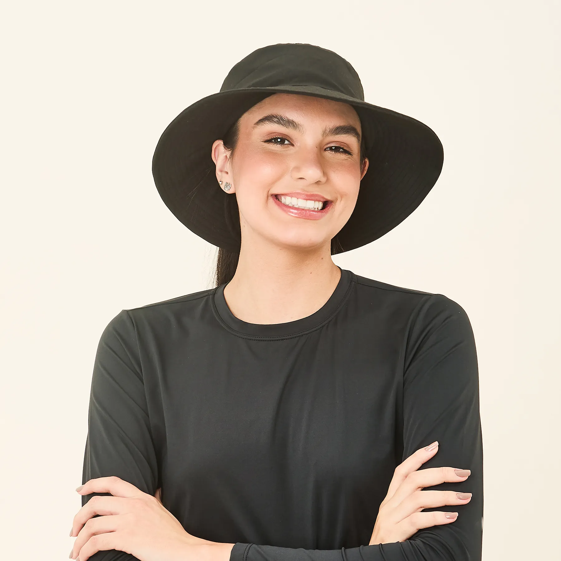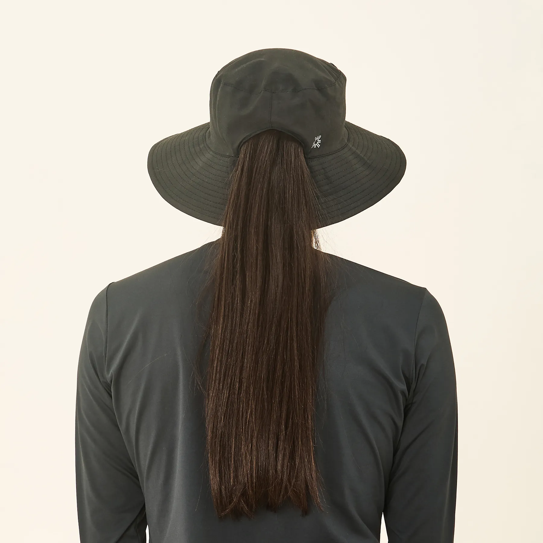 A estrutura do chapéu inclui abertura traseira, permitindo uso com cabelo solto ou preso em rabo de cavalo, sem comprometer o encaixe nem o nível de proteção. A aba de 8 cm cobre áreas sensíveis como rosto, olhos e parte frontal da cabeça, ajudando a prevenir queimaduras, manchas e fotoenvelhecimento.