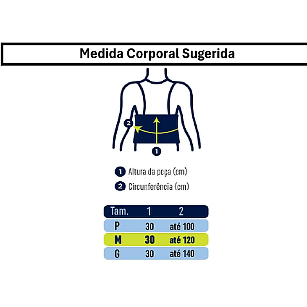 Como escolher o tamanho? Meça a circunferência abdominal: P (até 100 cm), M (até 120 cm), G (até 140 cm). Altura fixa 30 cm.