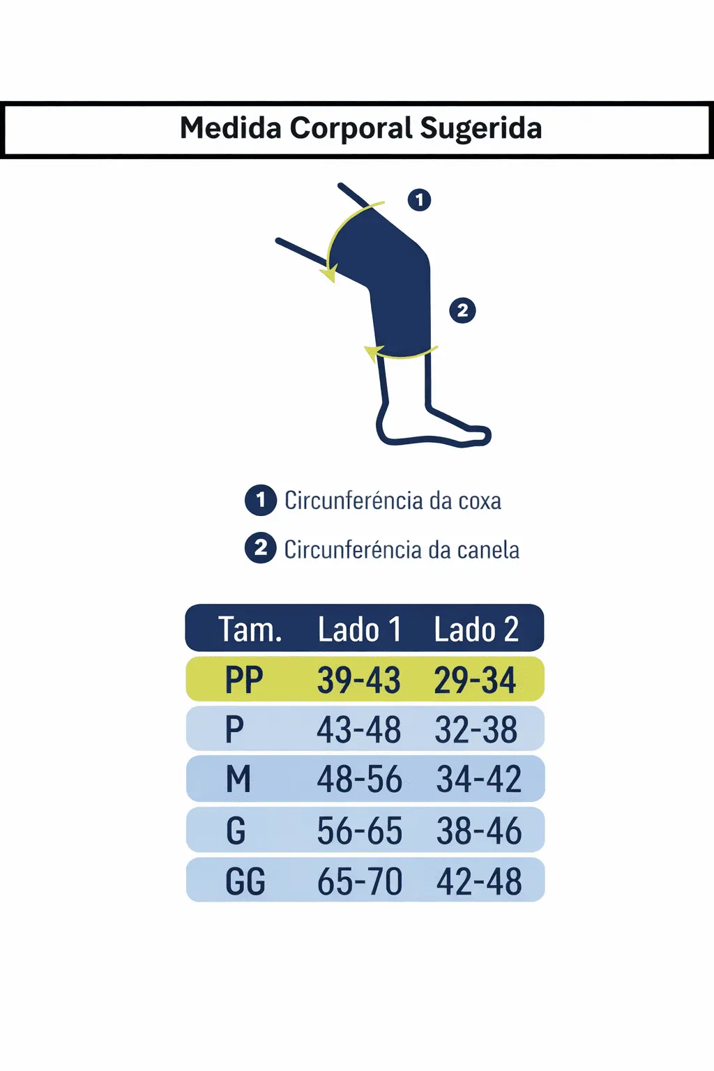 Como escolher o tamanho? Meça coxa (acima da patela) e canela (abaixo): PP (39-43/29-34 cm), P (43-48/32-38 cm), M (48-56/34-42 cm), G (56-65/38-46 cm), GG (65-70/42-48 cm). Altura fixa 33 cm.
