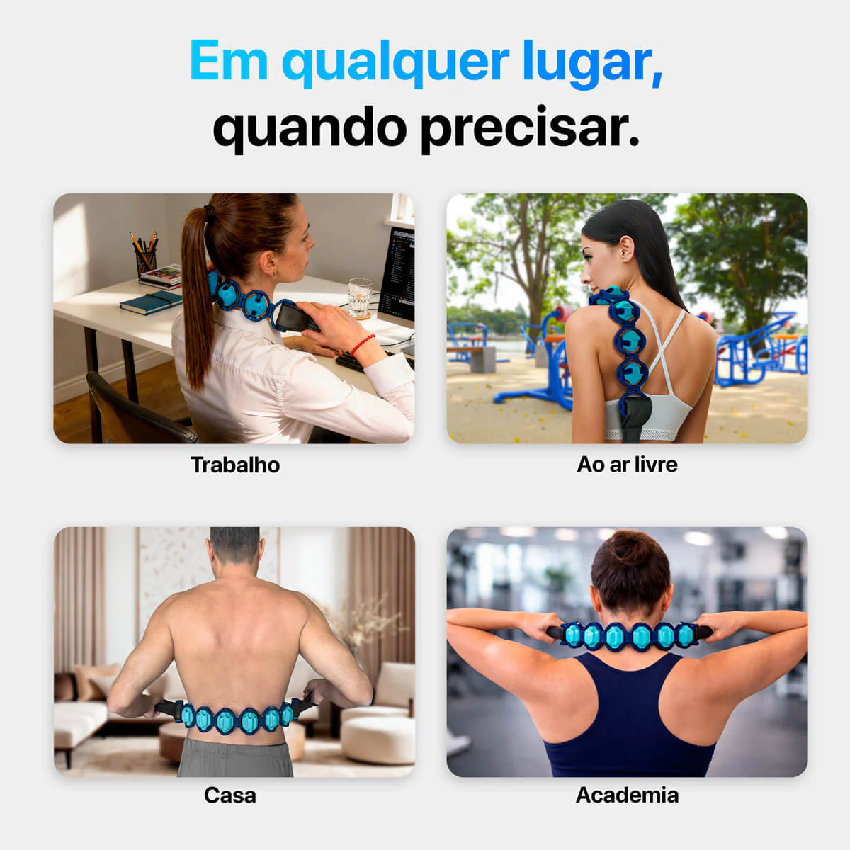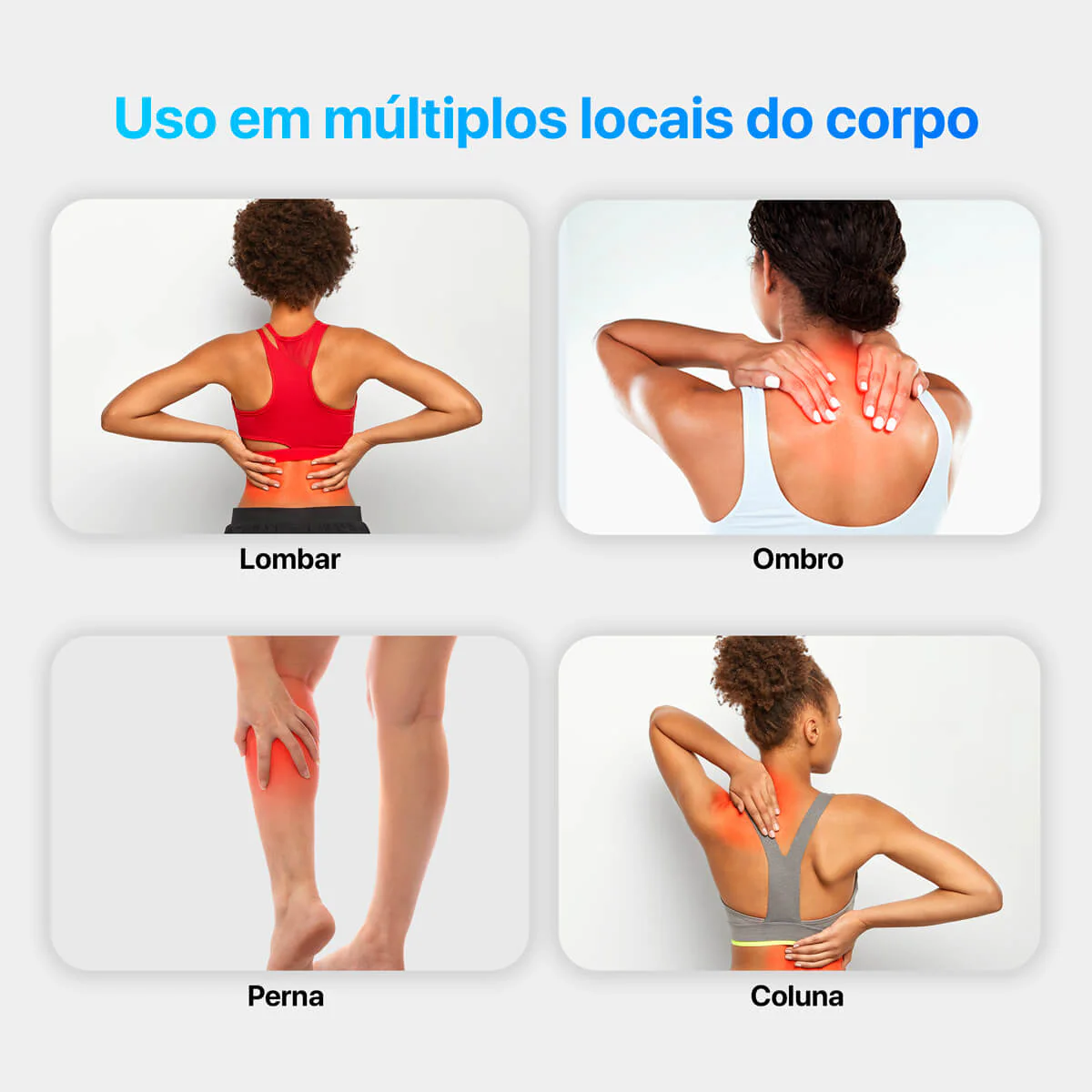 Pode ser aplicado em costas, ombros, lombar, pescoço, braços e pernas — adaptando-se às necessidades de diferentes regiões do corpo em uma única sessão.