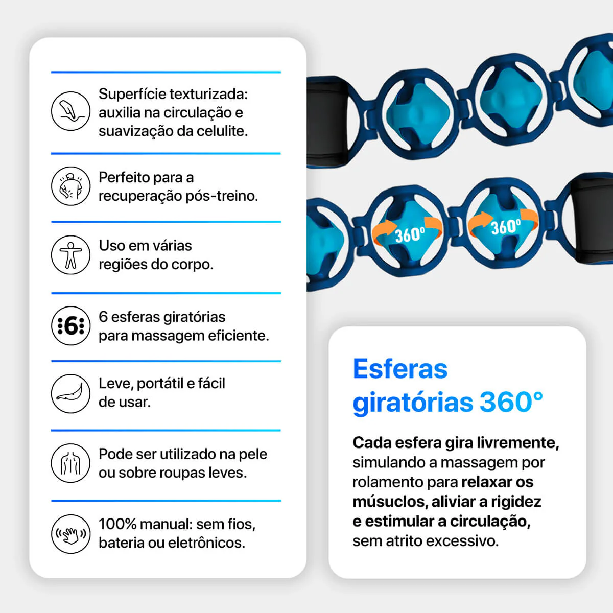 O movimento das esferas giratórias sobre a pele estimula a microcirculação local, contribuindo para maior oxigenação dos tecidos e sensação de leveza.