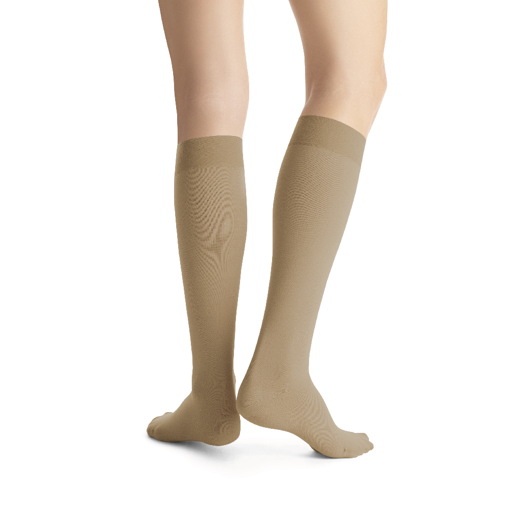 A JOBST® Opaque aplica maior pressão na região do tornozelo, que diminui progressivamente ao longo da panturrilha. Esse gradiente de pressão atua como uma "bomba" que estimula o retorno venoso e linfático, reduzindo o acúmulo de líquidos e a sensação de peso nas pernas. O tecido opaco com fios de múltiplas fibras proporciona toque algodonado e facilidade de colocação, enquanto a tecnologia JOBST Advanced Comfort mantém os pés secos ao longo de todo o dia, controlando a umidade. O resultado é uma circulação mais eficiente, menos cansaço e pernas mais leves, com visual discreto e cobertura que disfarça irregularidades venosas visíveis.