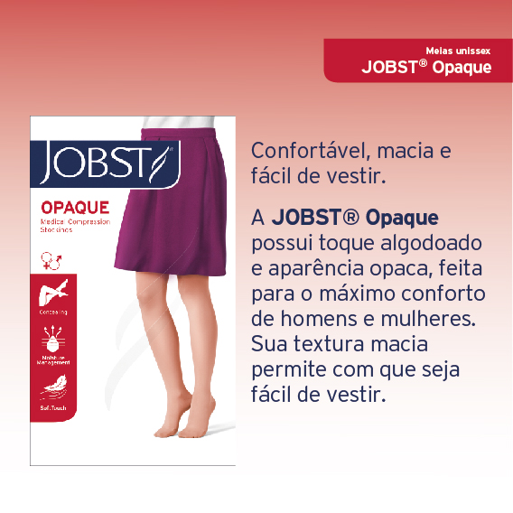 A JOBST® Opaque é uma meia de compressão terapêutica graduada com aparência opaca e toque algodonado, desenvolvida para homens e mulheres que buscam alívio de pernas cansadas, pesadas e com tendência a inchar, com o diferencial estético de disfarçar manchas e irregularidades causadas pela insuficiência venosa. É amplamente utilizada por profissionais que ficam muitas horas em pé ou sentados e por quem precisa de uma meia terapêutica com visual discreto para o uso diário. Composta por fios de múltiplas fibras de alta qualidade, oferece suavidade, facilidade na colocação e durabilidade superior.