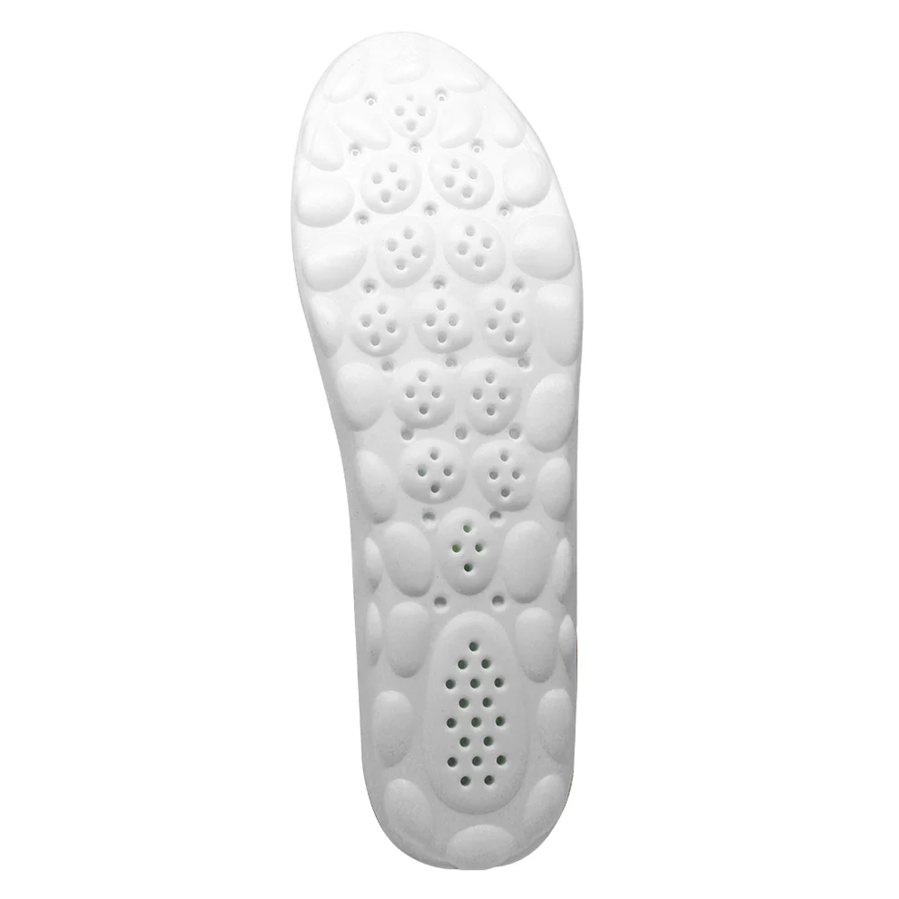 A Palmilha Fly Feet Nuvem atua em duas frentes complementares. As saliências estimulantes na superfície agem diretamente nos nervos da planta do pé, acionando os principais pontos de tensão e estimulando a circulação sanguínea local — mecanismo semelhante ao utilizado em técnicas de reflexologia e fisioterapia sensorial. Os gomos protetores distribuem a pressão plantar de forma uniforme, absorvendo o impacto de cada passada e protegendo regiões críticas como calcâneo, arco e metatarsos. A combinação dos dois elementos proporciona conforto imediato, redução da fadiga e proteção contínua ao longo do dia.