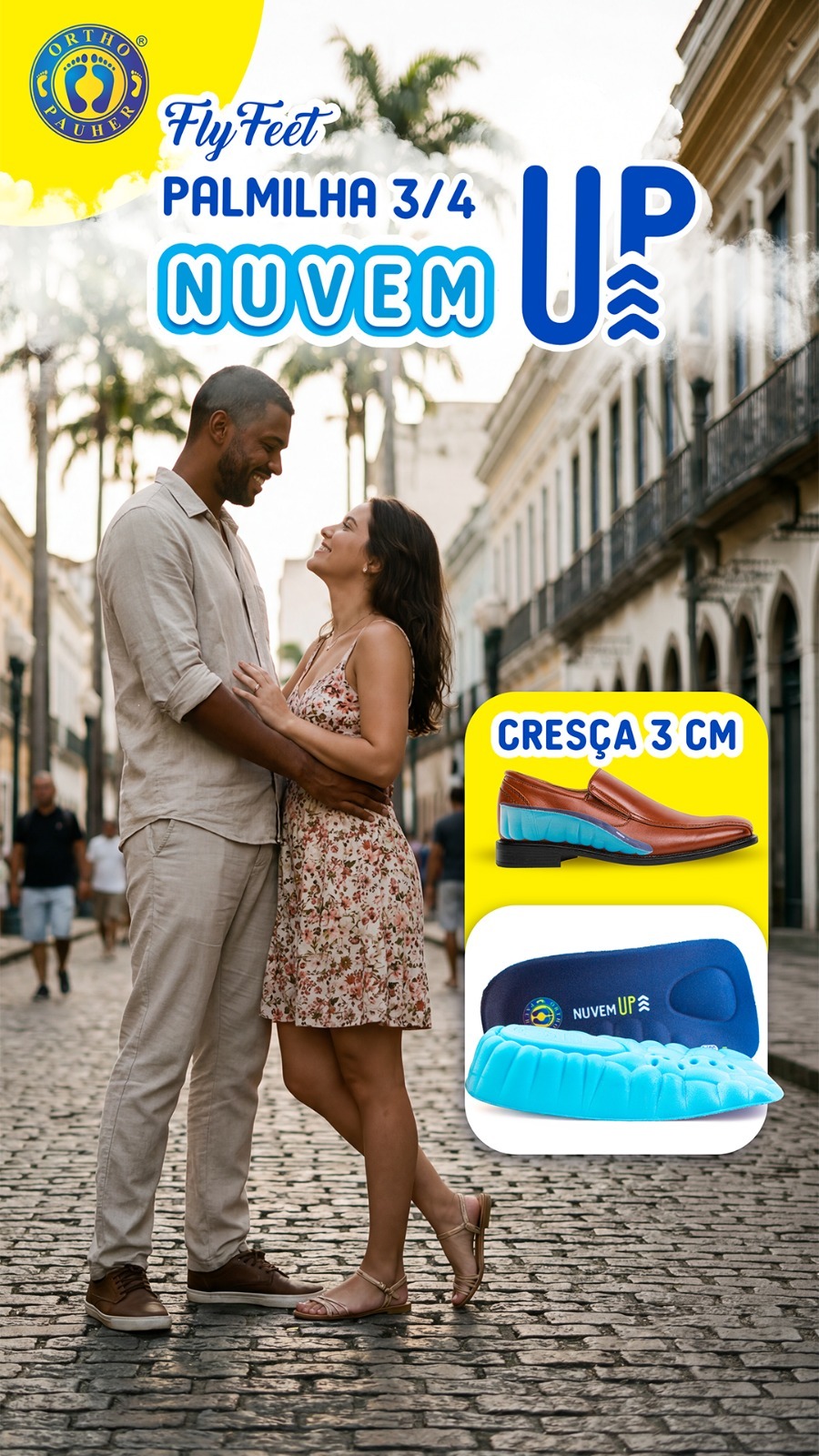 A Ortho Pauher é uma marca especializada em produtos ortopédicos para os pés, reconhecida no Brasil pelo desenvolvimento de palmilhas com tecnologia de conforto avançada. A linha Fly Feet Nuvem é utilizada por pessoas que buscam tanto alívio de condições clínicas como esporao e fascite quanto conforto no uso diário. A Nuvem Up representa uma evolução dessa linha ao incorporar a elevação de 3 cm sem abrir mão do suporte ortopédico, sendo indicada por profissionais de saúde como fisioterapeutas e podólogos para pacientes que combinam necessidade terapêutica com praticidade no dia a dia.