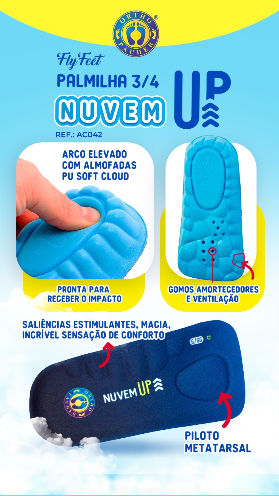 A Palmilha Fly Feet Nuvem Up é uma palmilha ortopédica 3/4 desenvolvida pela Ortho Pauher para combinar dois benefícios em um único produto: o aumento instantâneo de 3 cm na estatura e o suporte ortopédico para dores plantares. O modelo é uma evolução da Palmilha Nuvem tradicional, com design compacto 3/4 que ocupa menos espaço interno do calçado e se adapta melhor a modelos de extremidade mais estreita. O arco elevado com almofadas PU Soft Cloud, os gomos amortecedores com ventilação e o piloto metatarsal formam um sistema completo de proteção, absorção de impacto e estímulo plantar para uso diário.
