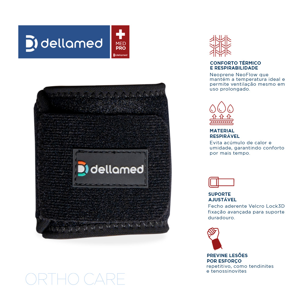 O Protetor de Punho Ortho Care Dellamed oferece suporte, compressão ortopédica e estabilidade ao punho, ideal para prevenção e tratamento de lesões por esforço repetitivo, dores, inflamações ou síndrome do túnel do carpo.