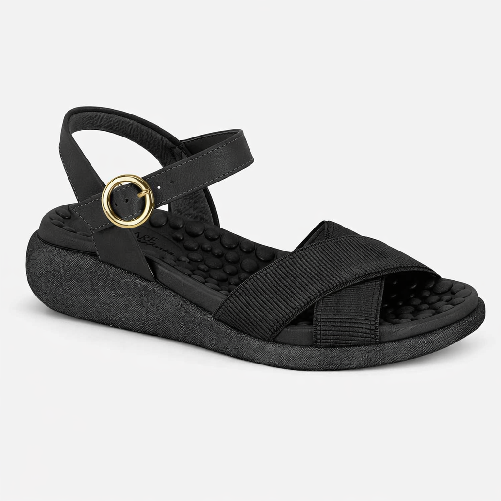 Sim. O elástico flexível é projetado para proporcionar ajuste anatômico ao pé, mantendo a sandália segura durante a caminhada sem apertar ou causar desconforto. Acomoda diferentes larguras de pé com naturalidade.