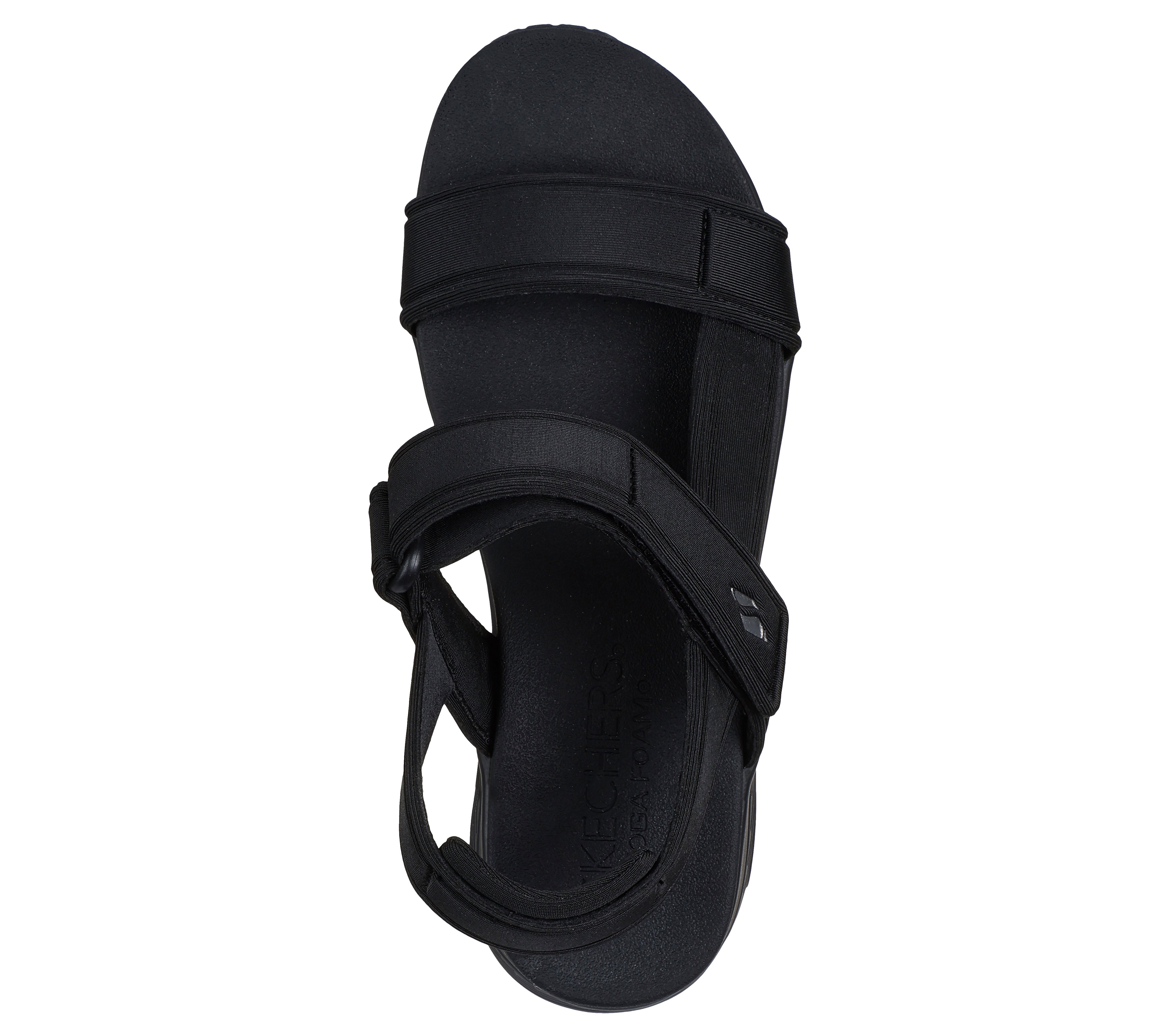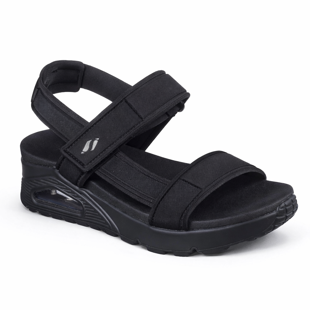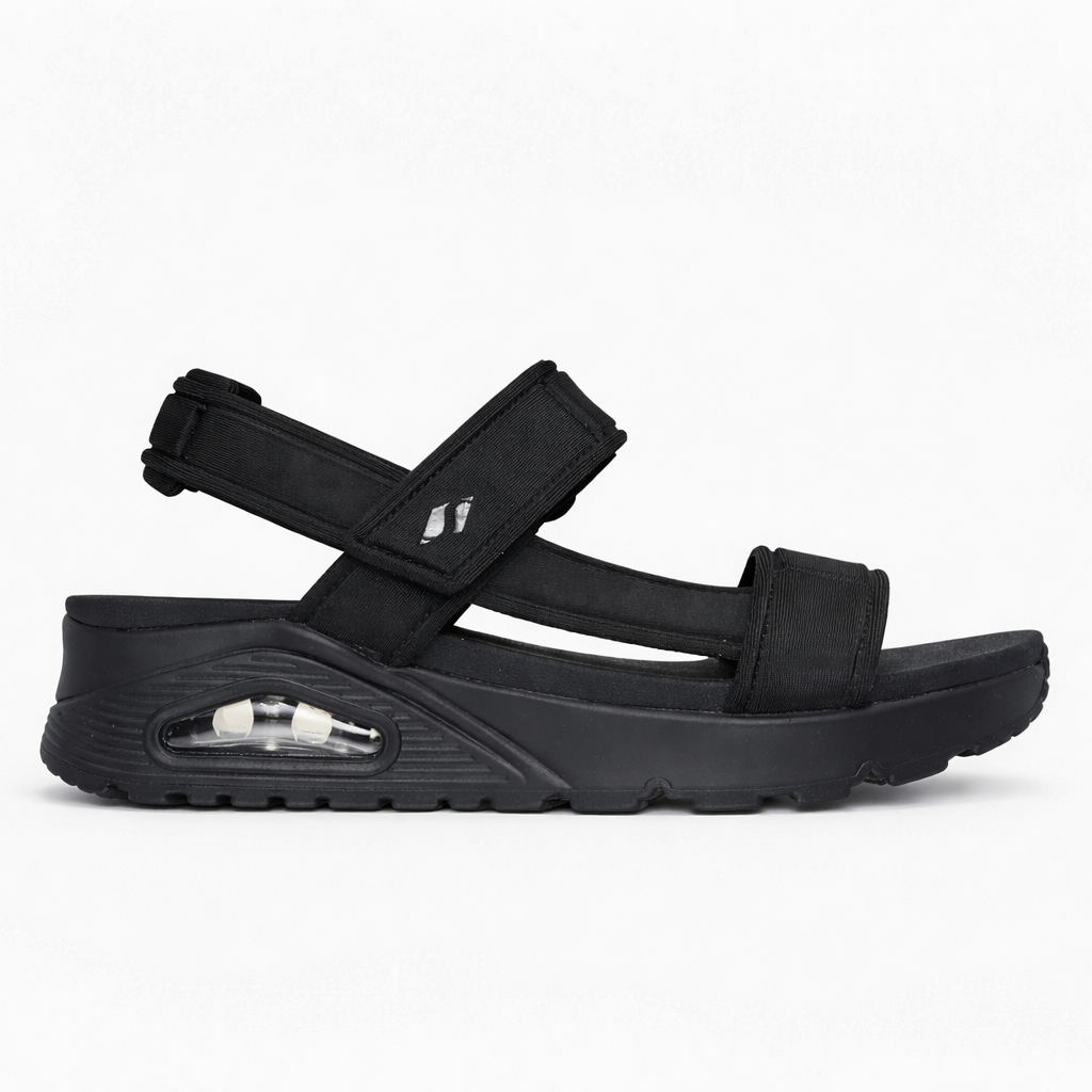 A Skechers Uno Summer Stand2 e uma sandalia feminina vegana desenvolvida como uma releitura da silhueta classica da linha UNO, uma das mais reconhecidas da Skechers, adaptada para o uso aberto na temporada quente. O modelo 119813 utiliza cabedal em nylon texturizado — material 100% sintetico, sem couro ou componentes de origem animal — com alca slingback no calcanhar de ajuste regulavel para maior seguranca e personalizacao do caimento. A palmilha interna em Yoga Foam oferece acolchoamento macio e moldavel, enquanto a entressola com tecnologia Skech-Air incorpora camaras de ar que absorvem o impacto e proporcionam sensacao de leveza a cada passo. E uma sandalia que une a estetica urbana da linha UNO com funcionalidade, conforto e a proposta vegana da Skechers.