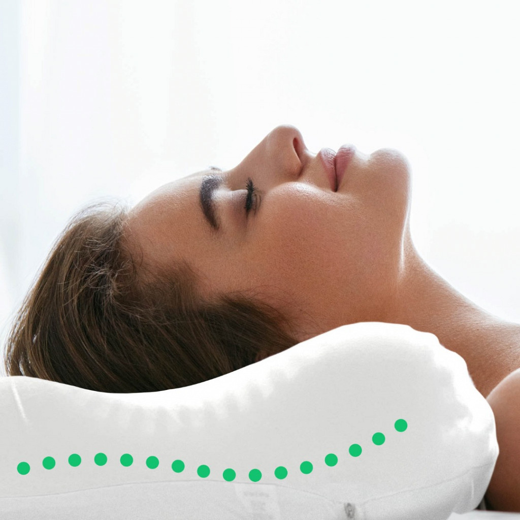 Design anatômico exclusivo com dois elevados laterais e rebaixo central que se adaptam à posição de dormir — de lado ou de costas — garantindo alinhamento cervical correto em cada posição.