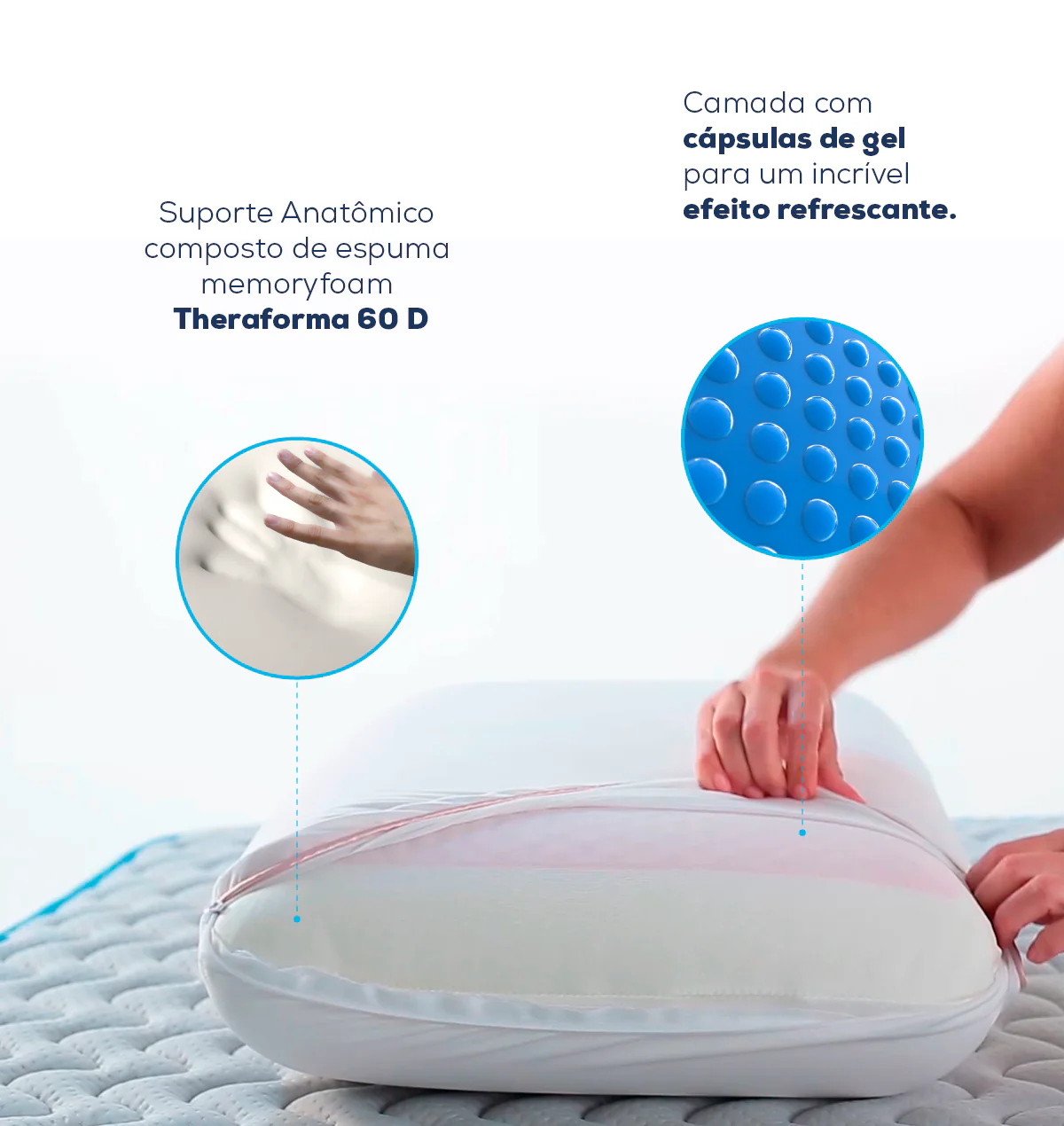 A proporção balanceada entre espuma e gel garante que o travesseiro ofereça tanto suporte ergonômico consistente quanto regulação térmica eficiente — sem sacrificar uma propriedade pela outra.