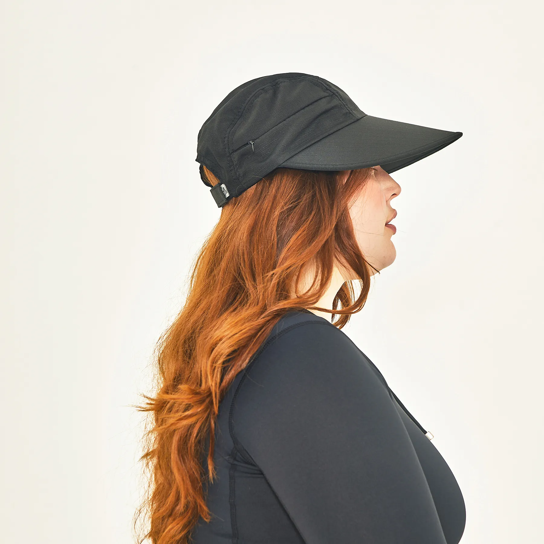 O diferencial desta viseira está no bolso lateral embutido com zíper, perfeito para guardar pequenos objetos como chaves, cartão ou dinheiro durante os treinos. Além disso, seu fecho em velcro exclusivo permite ajustes precisos, adaptando-se a diferentes formatos de cabeça — seja com o cabelo solto ou preso.