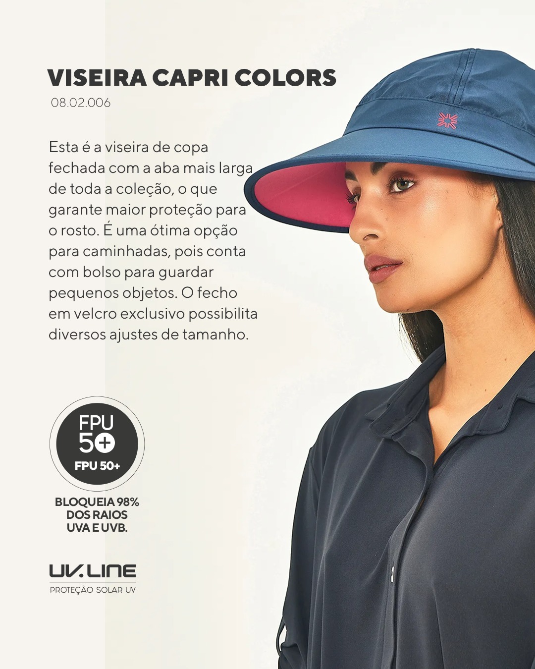 A Viseira UV Capri Colors FPU50+ é o modelo com a aba mais larga da coleção, garantindo proteção ampliada para o rosto durante caminhadas, corridas, praia, piscina e atividades ao ar livre. Sua copa fechada protege a cabeça do calor e da incidência direta dos raios UV, tornando-se uma escolha ideal para quem busca segurança e conforto sob o sol.